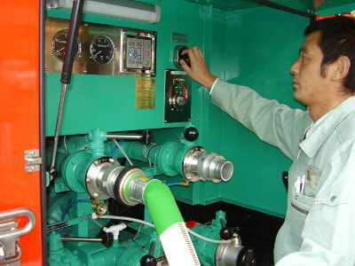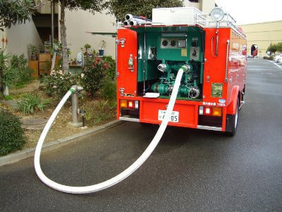 - 送水口から動力消防ポンプ、もしくはそれと同等の試験をおこなうことができる機器を用いて、設計送水圧まで加圧します。